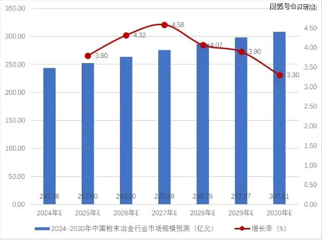 目前,粉末冶金技術已經(jīng)被廣泛應用于交通、機械、電子、航空航天、兵器、生物、5G通訊和新能源等領域。隨著這些領域?qū)Ψ勰┮苯甬a(chǎn)品的需求逐漸增大,金屬粉末的需求預計將會在未來十年快速增長,預計2024-2030年中國粉末冶金行業(yè)市場規(guī)模平穩(wěn)上升,到2030年中國粉末冶金行業(yè)市場規(guī)模將達到307.81億元。